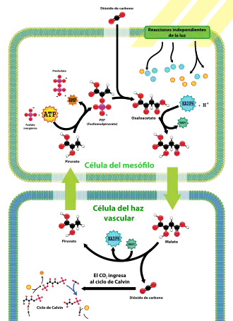 Para superar las limitaciones asociadas con la reacción secundaria de Rubisco en condiciones de bajo contenido de CO2 y alto O2 en la atmósfera, las plantas C4 han desarrollado un mecanismo eficaz para concentrar el CO2 en el sitio de Rubisco, creando condiciones favorables para la función de esta enzima. En lugar de la fijación directa de Rubisco en el ciclo de Calvin, el CO2 se asimila en las células del mesófilo en forma de un ácido orgánico de cuatro carbonos, que luego se transporta a las células de la vaina del haz vascular, donde se descarboxila, liberando CO2. El requisito previo anatómico para la inyección de CO2 es que existe un mayor número de células mesófilas (alrededor de 5-7 por célula de la vaina). Así, el CO2, previamente fijado en cinco celdas, entra en una sola. En las células de la vaina, el CO2 entra en el ciclo de Calvin normal, donde Rubisco se vuelve a fijar y se utiliza para la síntesis de carbohidratos. Debido al gradiente constante de metabolitos, así como a la pared de las células de revestimiento impermeable al CO2, la concentración de CO2 en el sitio de carboxilación de Rubisco, incluso con los estomas cerrados, aumenta 14 veces en comparación con la concentración de equilibrio de CO2 en agua (de 5 μmol/L a 70 μmol/L respectivamente). A concentraciones tan altas de CO2 en el sitio de carboxilación, la reacción de oxigenasa se suprime en gran medida, aumenta la eficiencia de la fotosíntesis y disminuyen las pérdidas de energía debido a la fotorrespiración.