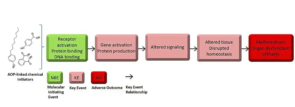 Una vía de resultado adverso (AOP) es una representación estructurada de eventos biológicos que conducen a efectos adversos y se considera relevante para la evaluación de riesgos.[1][2][3] El AOP vincula de manera lineal el conocimiento existente a lo largo de una o más series de eventos clave (KE) conectados causalmente entre dos puntos: un evento de iniciación molecular (MIE) y un resultado adverso (AO) que ocurren en un nivel de organización biológica relevante para Evaluación de riesgos.[2] El vínculo entre los eventos se describe mediante relaciones de eventos clave (KER) que describen las relaciones causales entre los eventos clave.