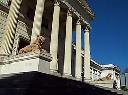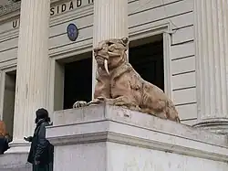 - Los doce bustos de científicos de la fachada , y los dos dientes de sable Smilodon, que flanquean la entrada al Museo de La Plata , 1888.