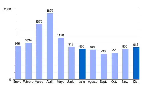 | Caudal medio mensual del Vístula en la estación de Tczew (en m³/s. Datos calculados en el período de 94 años, 1900-1994) |