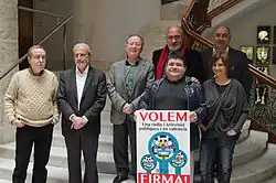 Tras esto, el Consejo de la Generalidad aprobó el 30 de diciembre de 2014 el anteproyecto de la Ley de Señas de Identidad del Pueblo Valenciano,[55] con la que se pretendía blindar «la individualidad de la lengua valenciana», además de otros temas como son los espectáculos taurinos, la gastronomía, la música y las fiestas populares valencianas.[56] Mediante esta ley se subvencionaría a la Real Academia de Cultura Valenciana y a Lo Rat Penat,[57] asociaciones privadas contrarias a la Academia Valenciana de la Lengua, ya que a diferencia de esta, ambas consideran que el valenciano es una lengua independiente y distinta del catalán, la cual se debe regir por las normas del Puig.[nota 1] Además de esto, el grupo parlamentario popular de las Cortes Valencianas pretendía ir más allá, ya que presentó varias enmiendas al anteproyecto, en las que se pedía que los títulos de valenciano emitidos por estas instituciones así como las normas del Puig se consideraran oficiales.[58] El 7 de enero de 2015, el Consejo Jurídico Consultivo afirmó que el proyecto de ley de Señas «adolece de un marcado carácter programático y los objetivos que se persiguen con esa norma ya se encuentran al alcance de los poderes públicos sin necesidad de una nueva norma con rango legal en el ordenamiento.»[59] Finalmente, el pleno de las Cortes Valencianas aprobó el 25 de marzo la «Ley de reconocimiento, protección y promoción de las señas de identidad del pueblo valenciano» con los votos en solitario del PP, mientras que la oposición abandonó el hemiciclo en señal de protesta.[60]