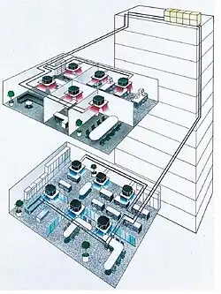 De la misma forma que los sistemas split simples, los sistemas VRF usan un fluido como medio de refrigeración y calentamiento. Este se acondiciona mediante una unidad de condensación exterior y se hace circular dentro de la construcción mediante tubos que conectan a múltiples unidades remotas, repartidas en uno o varios ambientes.