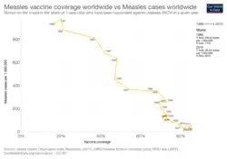 Cobertura mundial de vacunación de 1980 a 2019 entre los niños de un año[61]