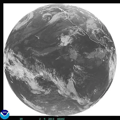 - En segundo lugar, las enormes dimensiones de las vaguadas obligan a que usemos mapas meteorológicos a escala sinóptica (que abarca grandes extensiones de la superficie terrestre, como nos indica la etimología del término sinopsis: visión general) y, además, que tengamos en cuenta, no sólo el trazado de las isóbaras a nivel de la superficie, sino también a niveles superiores en la troposfera. Esas enormes dimensiones quedan representadas por la imagen infrarroja del Océano Pacífico, donde se puede ver que la zona alargada de nubes cubre casi un hemisferio, mientras que cubre una superficie de alrededor de 10 millones de km 2.