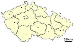 Se encuentra ubicada al norte de la región, a poca distancia al este de Brno, de la orilla del río Morava —un afluente izquierdo del Danubio—, de la cordillera de Beskides moravo-silesios —zona occidental de los montes Cárpatos— y de la frontera con Eslovaquia y la región de Moravia-Silesia.[1]