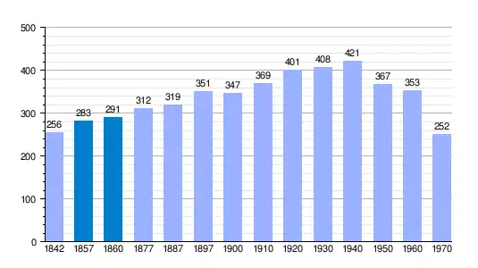 | Gráfica de evolución demográfica de Valdeganga de Cuenca[3] entre 1842 y 1970 |