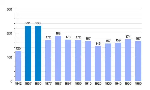 | Gráfica de evolución demográfica de Valdelagua[4] entre 1842 y 1960 |