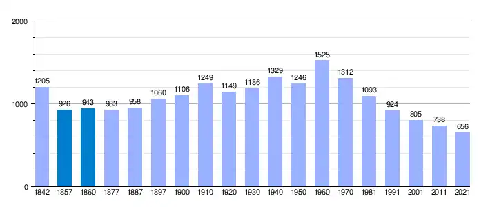 | Gráfica de evolución demográfica de Valdeobispo[10] entre 1842 y 2021 |