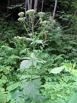 Hierba perenne, monocaule, no estolonífera, con rizoma grueso, simple. Tallos hasta de 215 cm, erectos, por lo general simples, fistulosos, densamente pelosos en los nudos. Hojas pecioladas, pelosas en los nervios y pecíolo; las basales y caulinares inferiores con pecíolo de (100)120-250(400) mm y limbo de (50)65-180(220) × (60)70-200(250) mm, ovado, cordiforme u orbicular, crenado o serrado –en ocasiones doblemente serrado o subentero–; las caulinares medias y superiores indivisas o, menos frecuentemente, trisectas o pinnatisectas, subsésiles o con pecíolo de (3)5-35(60) mm, y limbo –o segmento terminal– de (60)80-130(180) × (25)40-100(120) mm, ovado, lanceolado o lanceoladoacuminado, crenado o serrado, a veces con 1(2) pares de segmentos laterales de (20)30-60(70) × (4)10-30(35) mm, acuminados. Inflorescencia corimbiforme, con brácteas lanceoladas o linear-lanceoladas, enteras o serradas, y bractéolas lineares o setáceas, enteras, ciliadas hacia la base. Flores hermafroditas. Corola (3)4-5,5 mm, rosada, glabra por el exterior; tubo con giba de 0,1-0,2 mm, peloso en su interior; limbo con lóbulo superior de (1,2)1,5-2,5 mm, los restantes de (0,8)1,2-1,7(2,2) mm. Anteras 0,8-1,2(1,5) mm. Aquenio (3)3,5-5(5,5) mm, oblongo o linear-oblongo, de sección semicircular, glabro, con costillas laterales de la cara posterior algo arqueadas al menos hacia la base. Vilano con tubo de 0,1-0,7 mm, acopado, membranáceo, y 11-16 setas de (3,5)5-7,7 mm, caedizo.[1]