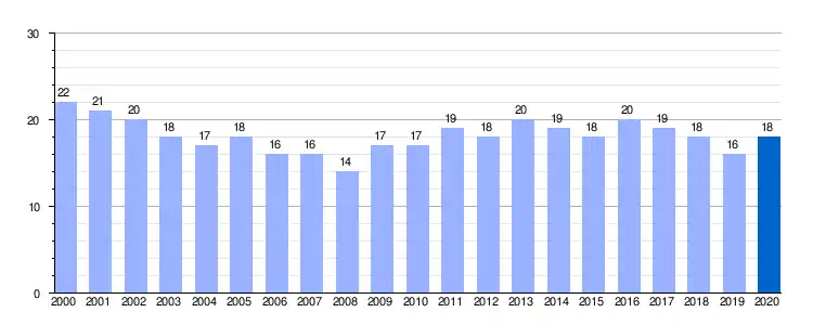 | Gráfica de evolución demográfica de Valle de Santullán entre 2000 y 2020 |