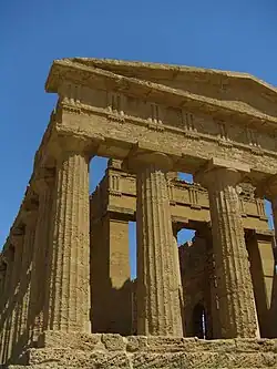 Al oeste del Olimpieion se extiende hasta la Puerta V un barrio de la ciudad, con vestigios de casas de habitación. Del norte de este templo parte una vía procesional que rodea las viviendas para incorporarse a la Puerta V y al templo de los Dioscuros. Es un nombre atribuido arbitrariamente: fuentes antiguas nos dicen, ciertamente, que en Akragas se honraba a Cástor y Pólux, pero las últimas investigaciones tienden más bien a vincular a los gemelos al llamado tradicionalmente «templo de la Concordia». Data de mediados del siglo V a. C. Pertenece al estilo dórico períptero y mide 13,86 × 31,70 m.