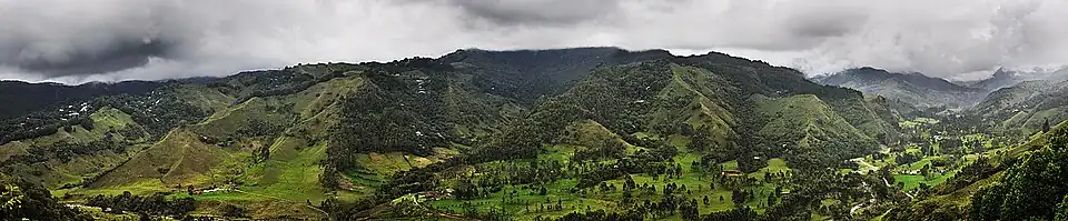 El valle de Cocora es un paisaje natural localizado en la cordillera central de los Andes colombianos, específicamente en el departamento del Quindío, en el área de influencia del Parque nacional natural Los Nevados. Cuenta con algunas poblaciones del árbol nacional de Colombia, la palma de cera del Quindío (Ceroxylon quindiuense), así como de una gran variedad de flora y fauna, mucha de ella en peligro de extinción, protegida bajo el estatus de parque nacional natural. El valle, así como la localidad cercana de Salento, se ubican entre los principales destinos turísticos de Colombia.[1]