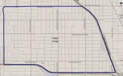 Los límites de Valley Village según lo delimitado por el Consejo Vecinal de Valley Village son Burbank Blvd al norte, Tujunga Wash al oeste, Ventura Freeway (US 101) al sur y CA 170 hacia el este.[9]