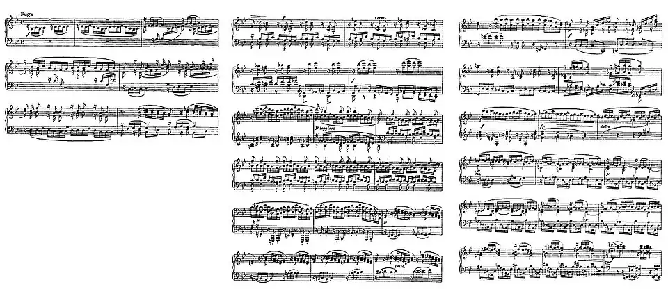 "Brahms lleva su tema derivado a relaciones contrapuntísticas que involucran disminución, aumento, stretto, construyendo hasta la peroración final a través de un largo pedal dominante con dos ideas distintas. Pero el pianismo es un parte de la concepción, y en este, el ejemplo más complejo del estilo virtuoso de Brahms, los espacios característicos en terceras, sextas y amplios intervalos entre las manos se emplean como nunca antes. De hecho esto sirve para crear los grandes contrastes dentro la fuga, que trasciende de un movimiento fuga tradicional para crear un conjunto adicional de variaciones, en las que muchas de las texturas anteriores se recuerdan en el contexto del tema fugado igualmente transformado." [5]