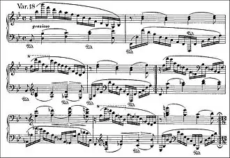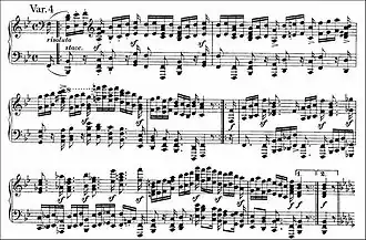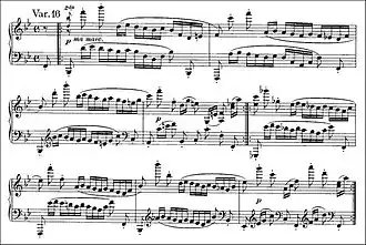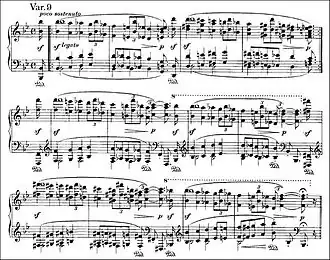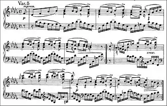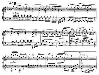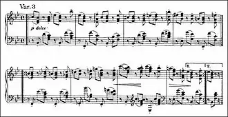 La elegante tercera variación, marcada como dolce, avanza a un ritmo más pausado, proporcionando una sensación de calma después de dos variaciones bastante densas. También proporciona un contraste muy necesario con la siguiente atronadora variación. Las manos derecha e izquierda se alternan y se superponen, la izquierda imita a la derecha en un patrón de tres corcheas. La primera nota de cada grupo se toca entrecortada, lo que aumenta la sensación de ligereza.