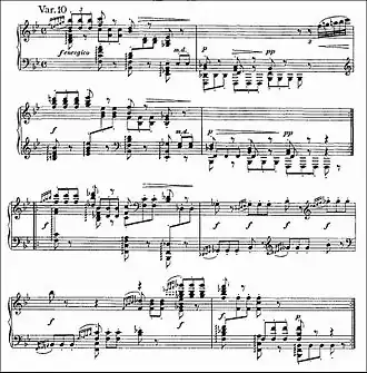 A diferencia de la anterior, la Variación 10 es un Allegro energico, rápido y estimulante. Su efecto resulta bastante extraño y suena casi desprovisto de melodía, ya que las notas principales del tema están dispersas en varios registros. La primera mitad consta de una serie de gestos sorprendentes que comienzan con acordes grandes y fuertes (fa energético) en los registros más altos, seguidos de ecos progresivamente más bajos, que terminan profundamente en el bajo en una serie de notas individuales que crean un gran clímax.
