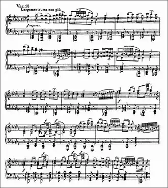 La variación 13 vuelve a la tónica menor en un tono fúnebre. Es la variación intermedia de la obra y, en opinión de Denis Matthews, el centro emocional de la misma. Las sextas de la mano derecha tocan contra acordes redondos en la izquierda, tal vez sugiriendo tambores amortiguados. Para Tovey, el tono lúgubre sugiere una "especie de marcha fúnebre húngara", mientras que Malcolm MacDonald la ve como "florida" y como "una fantasía húngara". Aquí Brahms abandona los habituales signos de repetición porque cada pasaje que se habría repetido se escribe una octava más alto.