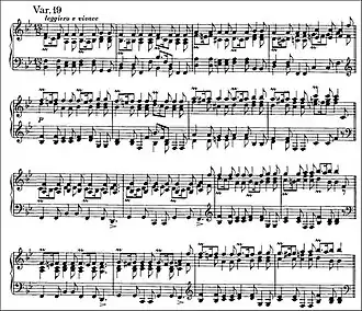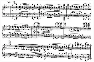 Las variaciones 13 y 14, aunque de carácter muy diferente, se combinan muy bien por ser rápidas y emocionantes y por el uso de sextas paralelas en la mano derecha.