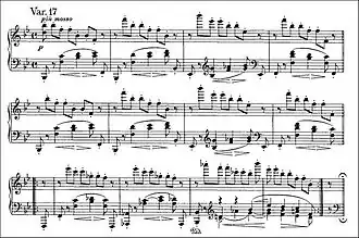 En la Variación 17, la ausencia de las semicorcheas que son tan prominentes en las dos variaciones anteriores da la impresión de una desaceleración, a pesar de la marca de più mosso. El efecto es el de gotas de lluvia que caen suavemente, con acordes rotos que descienden con gracia en la mano derecha, en piano y staccato, que se repiten a lo largo de la obra en varios tonos. Cada nota se toca dos veces, lo que aumenta la sugerencia de un ritmo pausado.