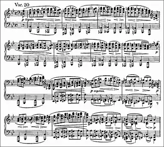 Desde el principio, la Variación 20 avanza hacia su clímax. A diferencia de la variación anterior, tiene poco de barroca con su cromatismo tanto en agudos como en graves y sus texturas espesas (tríadas en la mano derecha contra octavas en la mano izquierda). Malcolm MacDonald se refiere a sus "progresiones de órgano".[21]