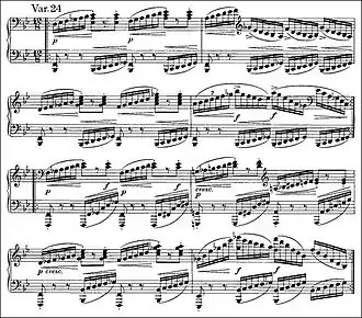 En preparación para la variación final culminante, la Variación 24 intensifica la emoción, reemplazando los tresillos de la Variación 23 con masas de semicorcheas. Claramente inspirada en la anterior, es otro ejemplo del uso que hace Brahms de la "variación de la variación".[5]