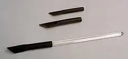 En realidad, el nombre se aplica a la goma que se coloca en el extremo de la varilla y su principal función es evitar rallar el recipiente de vidrio si se rascase directamente con el vidrio.[5][6]