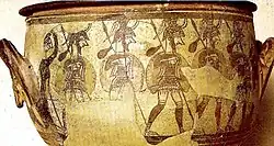 Las figuras de una cara del vaso llevan cascos con cuernos, mientras que los de la otra son de estilo "erizo". Los guerreros de ambos lados llevan escudos, túnicas y grebas;[4] todos parecen iguales y simbolizan al ejército en su conjunto, más que a guerreros individuales.[5]