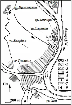 La ubicación de los talleres de alfarería junto a la plaza del mercado permitía a los artesanos supervisar simultáneamente el trabajo de los hornos donde cocían la cerámica y vender sus productos. La parte principal de la ciudad (Horodyshche, en terreno ocupado por el pueblo moderno) se extendía a lo largo de la primera terraza del Dniéster de norte a sur a lo largo de casi 3 km. En esta parte de la ciudad, las investigaciones arqueológicas han revelado principalmente viviendas de madera con paredes de pilares de troncos calentadas por estufas de barro.