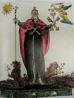 Otro ejemplo es el papa Pío VII (Barnaba Chiaramonti), que estuvo prisionero en la Francia de Napoleón, es dibujado como un papa en hábito monacal, que en un puño sostiene una rosa y en el otro una hoz que le amenaza; en el suelo está dibujada la letra B y hay una vista clara de los montes (Chiaramonti) en el fondo.