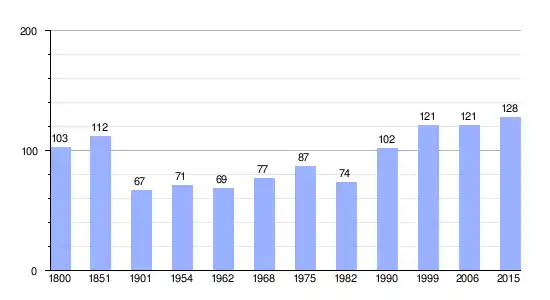 Los datos demográficos contemplados en este gráfico de la comuna de Vauchamps[4] se han cogido de 1800 a 1999 de la página francesa EHESS/Cassini, y los demás datos de la página del INSEE.[5]