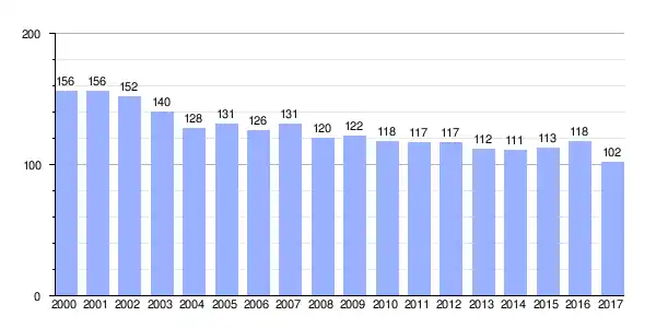 | Gráfica de evolución demográfica de Vega de Magaz[2] entre 2000 y 2017 |