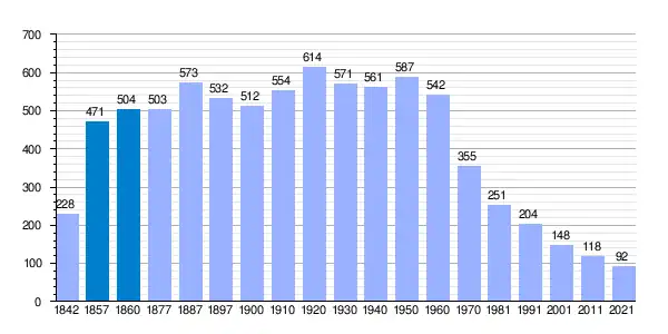 | Gráfica de evolución demográfica de Vega de Villalobos[8] entre 1842 y 2021 |