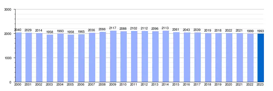 | Gráfica de evolución demográfica de Veguellina de Órbigo[2] entre 2000 y 2023 |