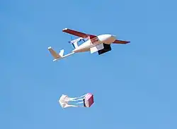 Wing, una compañía incubada por Google X, comenzó entregas comerciales en Christiansburg, Virginia, en octubre de 2019. Lleva paquetes de hasta tres libras, utilizando un cable para el último descenso. A partir de abril de 2020, los remitentes se limitaban a FedEx, Walgreens, Sugar Magnolia, Mockingbird Café y Brugh Coffee. Wing había obtenido un certificado de transportista aéreo Parte 135 de la FAA en abril de 2019, que le permitía cobrar por transportar carga de terceros y operar fuera de la línea de visión del piloto.