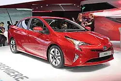 - Sistema combinado: el motor eléctrico funciona en solitario a baja velocidad, mientras que, a alta velocidad, el motor térmico y el eléctrico trabajan a la vez. El motor térmico combina las funciones de propulsión del vehículo y de alimentación del generador, que provee de energía al motor eléctrico, lo que suele aumentar la eficiencia del sistema, ya que se puede aprovechar la energía generada por el motor térmico, que en ciertas circunstancias puede ser en exceso y, en lugar de desperdiciarla, utilizarla para recargar las baterías del sistema eléctrico. El Toyota Prius utiliza este sistema,[16][17] ya que es un vehículo híbrido de gasolina y eléctrico paralelo,[18] siendo el modelo híbrido más vendido en el mundo, con más de 3 700 000 unidades vendidas hasta abril de 2016,[5] que tiene tanto una versión regular, como una enchufable.[19]