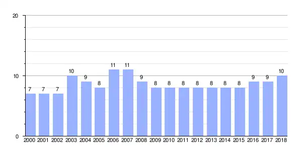| Gráfica de evolución demográfica de Veiga entre 2000 y 2018 |