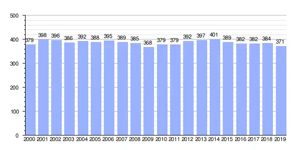 | Gráfica de evolución demográfica de Veiga entre 2000 y 2019 |