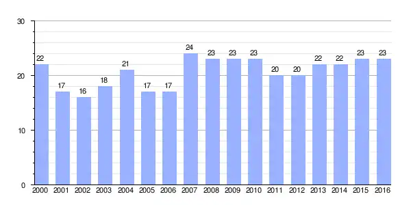 | Gráfica de evolución demográfica de Veldedo[2] entre 2000 y 2016 |