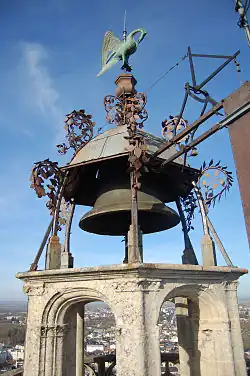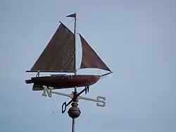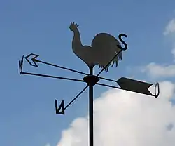 Una veleta es un artefacto giratorio que consta de una placa que gira libremente, un señalador que indica la dirección del viento y una cruz horizontal que indica los puntos cardinales. El motivo puede ser muy variado (figuras de animales, antropomorfas, entre otros).
