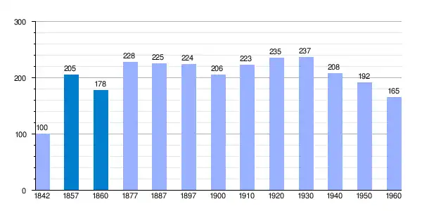 | Gráfica de evolución demográfica de Velilla de San Esteban[5] entre 1842 y 1960 |