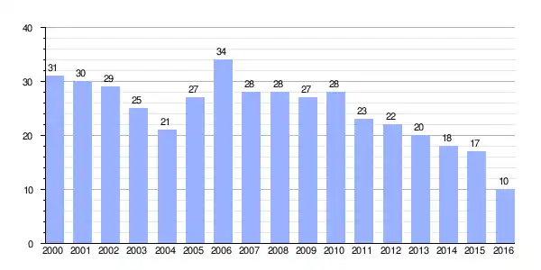 | Gráfica de evolución demográfica de Velilla de la Valduerna[2] entre 2000 y 2016 |