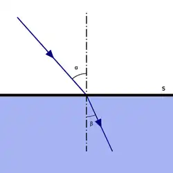 Los ángulos de incidencia (i) y de refracción (r) entre dos medios, y los índices de refracción, están relacionados por la Ley de Snell. Los ángulos se miden con respecto al vector normal a la superficie entre los medios: