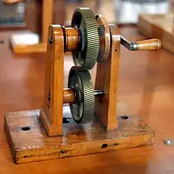 Así para dos ruedas que engranan, el producto del diámetro de una de ellas por el número de vueltas que da es igual al diámetro de la segunda rueda por su número de revoluciones.