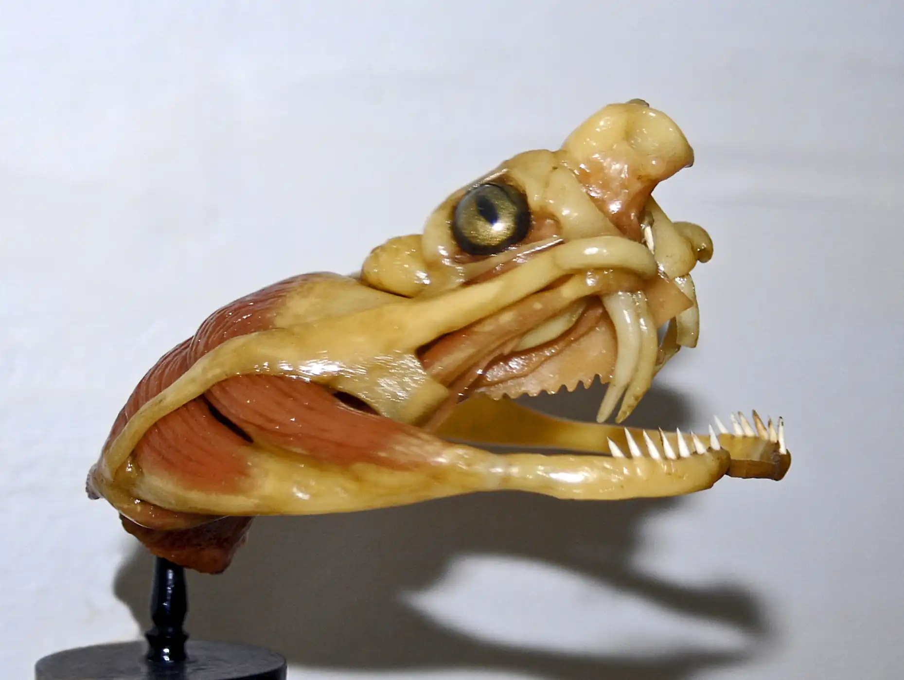 Entre las serpientes ponzoñosas, los vipéridos tienen el aparato de entrega de veneno más desarrollado. La glándula del veneno es muy grande y está rodeada por el músculo masetero o músculo temporal, que consiste en dos bandas, el superior se extiende de detrás del ojo, el inferior se extiende desde la glándula de la mandíbula. Un conducto lleva la ponzoña de la glándula al colmillo. En los vipéridos y elápidos, esta ranura está completamente encerrada, y es algo semejante al tubo de una aguja hipodérmica. En otras especies, las ranuras no están cubiertas, o sólo parcialmente cubiertas. Desde el extremo anterior de la glándula, el conducto pasa por debajo del ojo y por encima del hueso maxilar, al orificio basal del colmillo de veneno, que está envainado en un pliegue grueso de membrana mucosa. Por medio del hueso maxilar móvil, articulado al hueso prefrontal y conectado con el hueso transversal el cual es empujado hacia adelante por los músculos que entran en acción al abrir la boca, el colmillo se erige y el tósigo se descarga a través del orificio distal. Cuando la serpiente muerde, las mandíbulas se cierran, los músculos que rodean la glándula de veneno se contraen, y la ponzoña es expulsada por los colmillos.