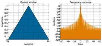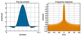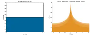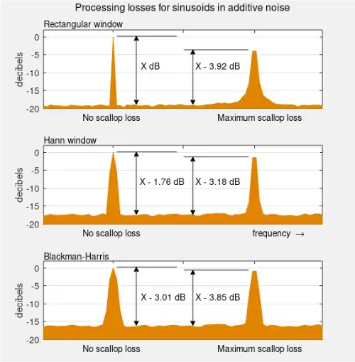Cuando la forma de onda es un muestreo, en lugar de una forma de onda continua, el análisis se lleva a cabo aplicando un función de ventana y después una transformada de Fourier discreta (DFT). Pero la DFR solo nos da un ralo muestreo del obtenible con el espectro de la discrete-time Fourier transform transformada de tiempo discreto de Fourier (DTFT). La figura 2 y 3 nos muestran una DTFT para una sinusoidal de ventana rectangular. La frecuencia real de la senoidal está indicad con "13" en el eje horizontal. Todo lo demás es goteo, exagerado por el uso de una escala logarítmica. La unidad de frecuencia es "DFR contenedores"; esto es, los valores enteros en el eje de la frecuencia corresponden a las frecuencias muestreadas por el DFT. Así que la figura muestra el caso donde la frecuencia actual de la senoidal coincida con un muestreo DFT, y el máximo valor del muestreo del espectro es precisamente medido en esa muestra. En el renglón 4, pierde el máximo valor por medio contenedor (bin), como resultado se califica como scalloping loss por la forma del pico. Para una frecuencia conocida, nota musical o señal de prueba, que coincida con la frecuencia de uno de los cajones, los parámetros pueden ser rearreglados, para las selecciones de la frecuencia de muestreo y el largo de la ventana, de modo que resulte en un número entero de ciclos dentro de la ventana.