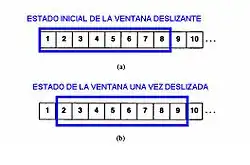 Por ejemplo, en una ventana deslizante de tamaño 8, el emisor puede transmitir hasta 8 segmentos sin recibir validación de ninguno de ellos. Figura 1.a). Entonces esperará una confirmación de recepción procedente del receptor sin enviar ningún paquete más. Una vez el emisor reciba una validación del primer paquete que envió, perteneciente al número 1 de 8 de la ventana deslizante, la ventana se deslizará abarcando 8 posiciones (su ancho de ventana definido), pero en este caso desde la 2 hasta la 9 y enviará la trama número 9 continuando a la espera de recibir más confirmaciones para poder seguir deslizándose y enviando las tramas siguientes. Figura 1.b).