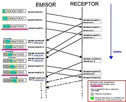 El protocolo de ventana deslizante permite al emisor transmitir múltiples segmentos de información antes de comenzar la espera para que el receptor le confirme la recepción de los segmentos. Tal confirmación se llama validación, y consiste en el envío de mensajes denominados ACK del receptor al emisor. La validación se realiza desde el receptor al emisor y contiene el número de la siguiente trama que espera recibir el receptor, o el de la última trama recibida con éxito, ACK n (siendo n el número de la trama indicada). Con esta indicación el emisor es capaz de distinguir el número de los envíos realizados con éxito, los envíos perdidos y envíos que se esperan recibir.