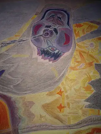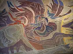 - Fresken La historia del sol y la tormenta (1951) en la escalera de la escuela Västertorps, Estocolmo, (Fresken Sagan om solen och stormen (1951) i trapphallen i Västertorps skola).