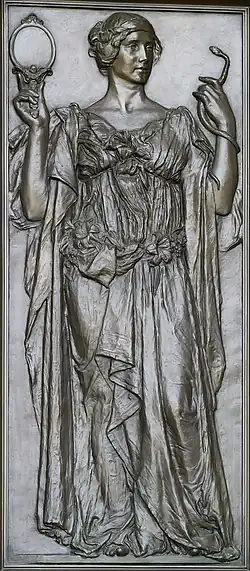 Verdad (Truth) por Olin Warner en la Puerta de bronce en la entrada de la Biblioteca del Congreso, Edificio Thomas Jefferson, 1896.