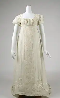A principios del siglo XX, estaba de moda el look popularizado por la Gibson girl.[16] La parte superior de los vestidos femeninos de la época eduardiana incluía un aspecto de "pecho paloma" que daba paso a una cintura encorsetada y una silueta en forma de s.[16] Las mujeres llamaban a sus vestidos "cinturas" si eran de una sola pieza, o "vestidos camiseros", si consistían en una falda y una blusa.[17] El corpiño de los vestidos tenía un forro deshuesado.[17] Informalmente, las mujeres ricas llevaban vestido de té en casa.[18] Estas prendas eran más holgadas, aunque no tanto como un "chal", y estaban confeccionadas con tejidos y encajes caros.